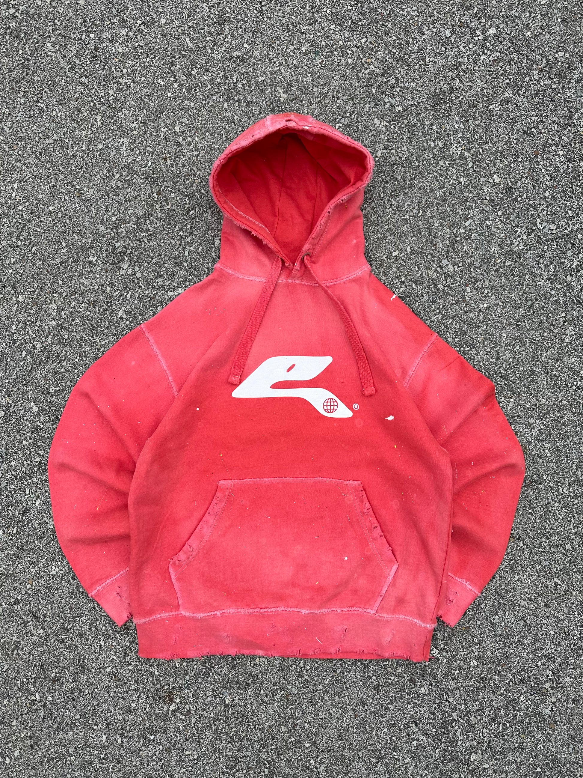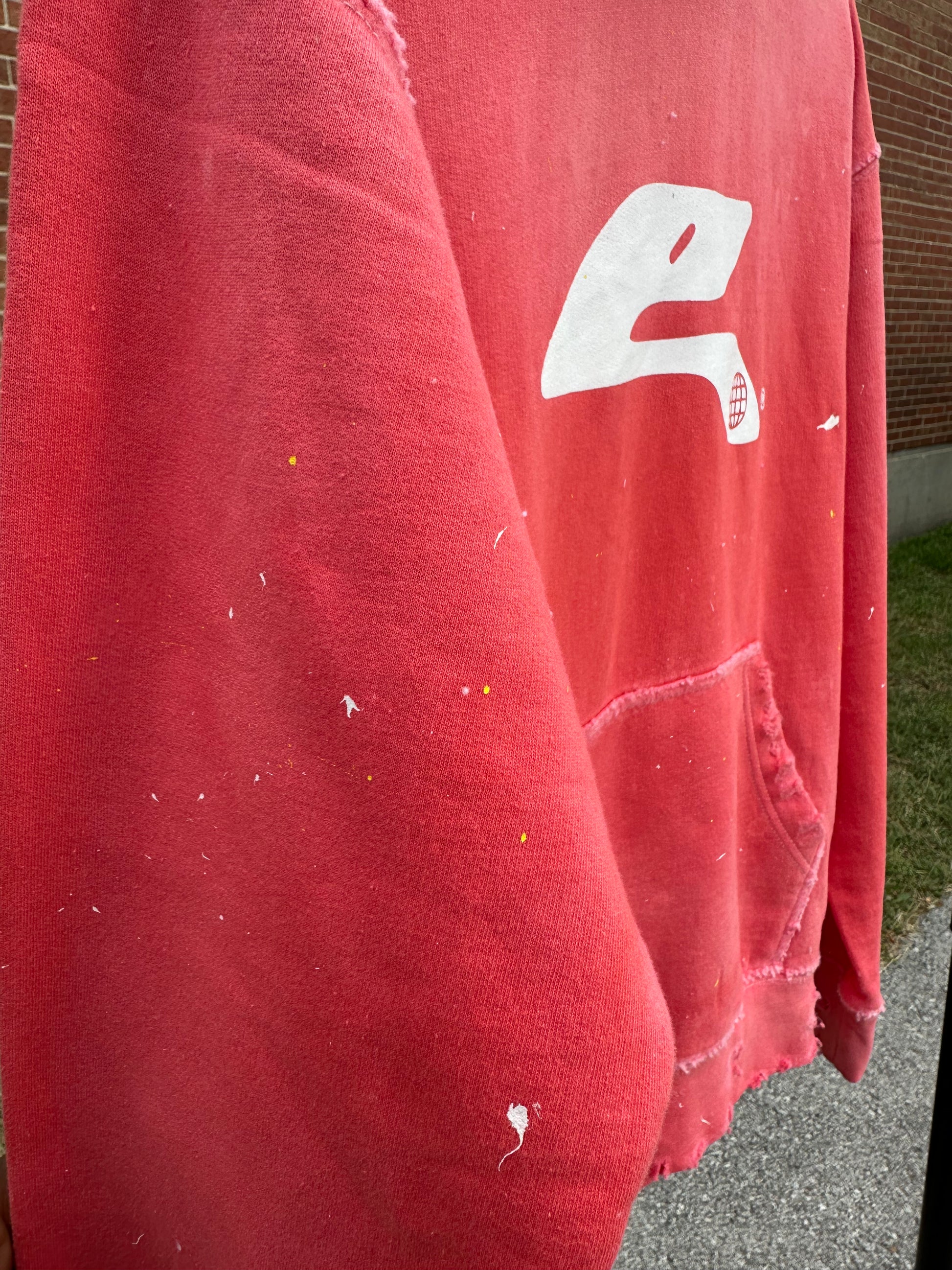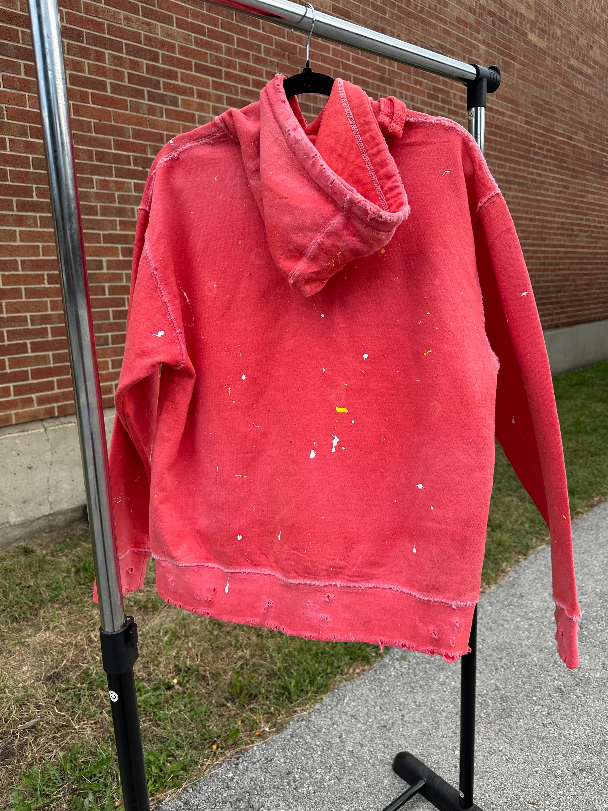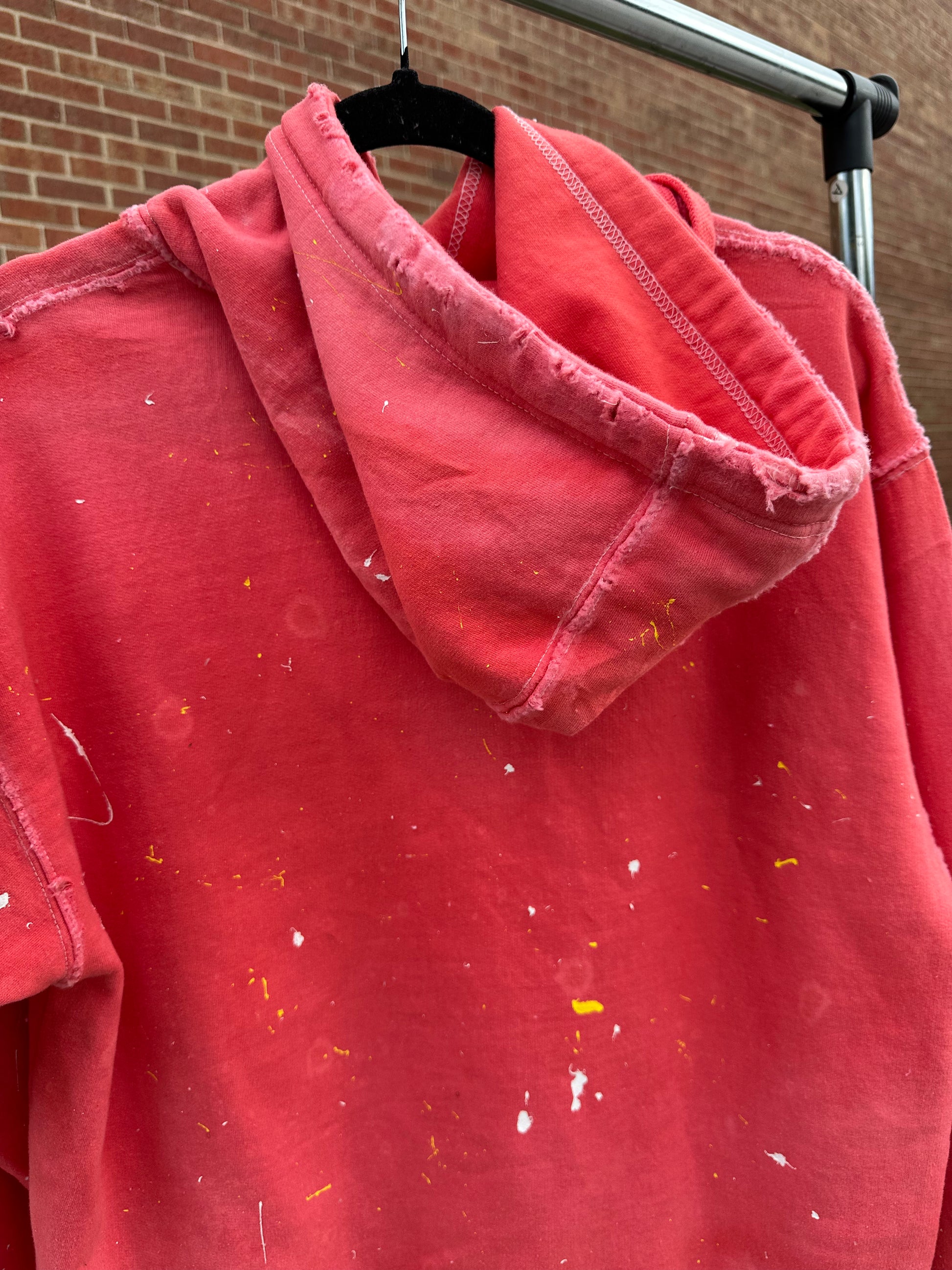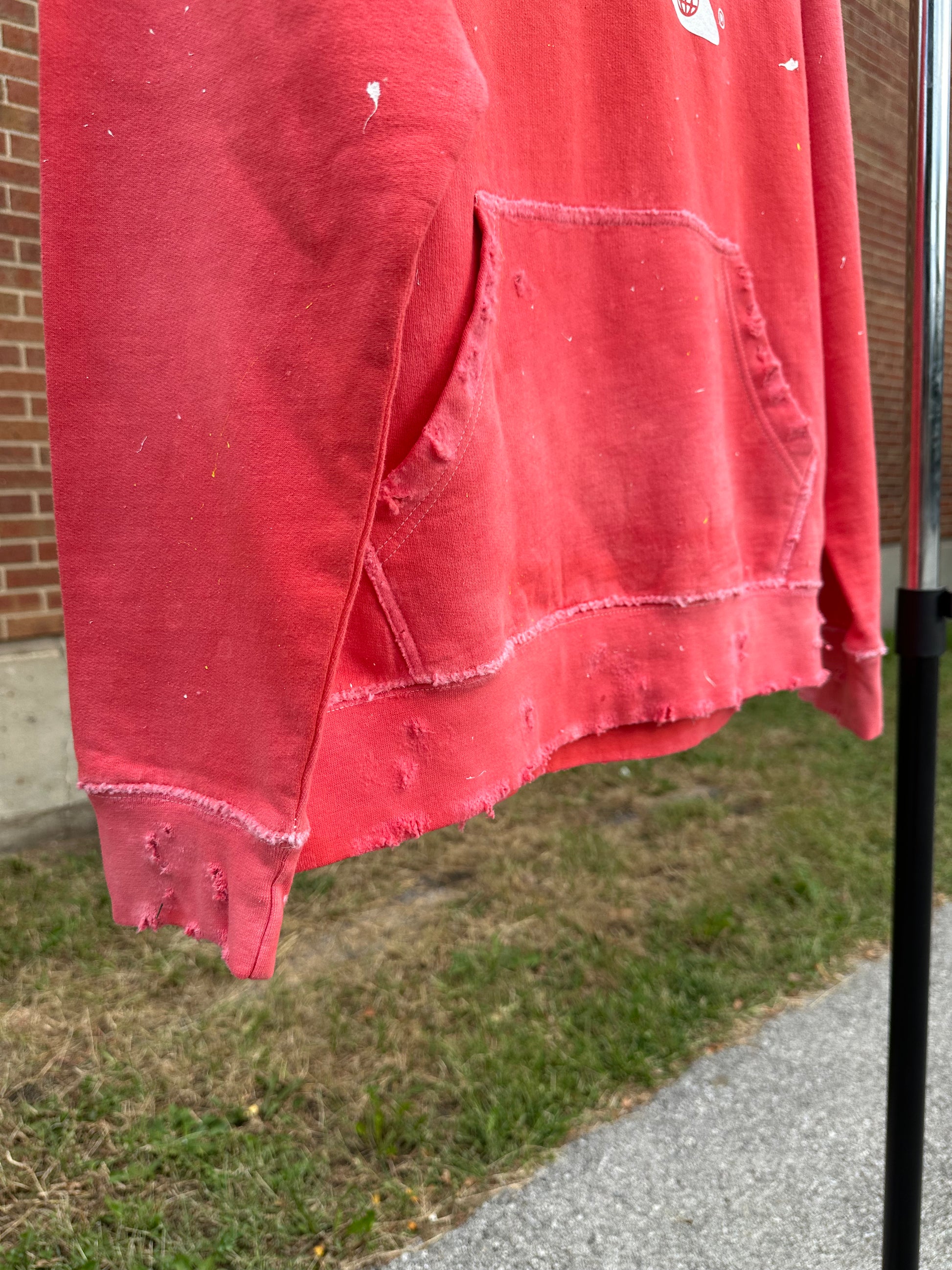 Originally a blank white base, this hoodie was hand-dyed into a rich coral-red tone that fades slightly toward the seams for a sun-washed effect. Subtle distressing along the hem and stitching gives it a lived-in, vintage energy—like it’s been worn through countless creative sessions.
