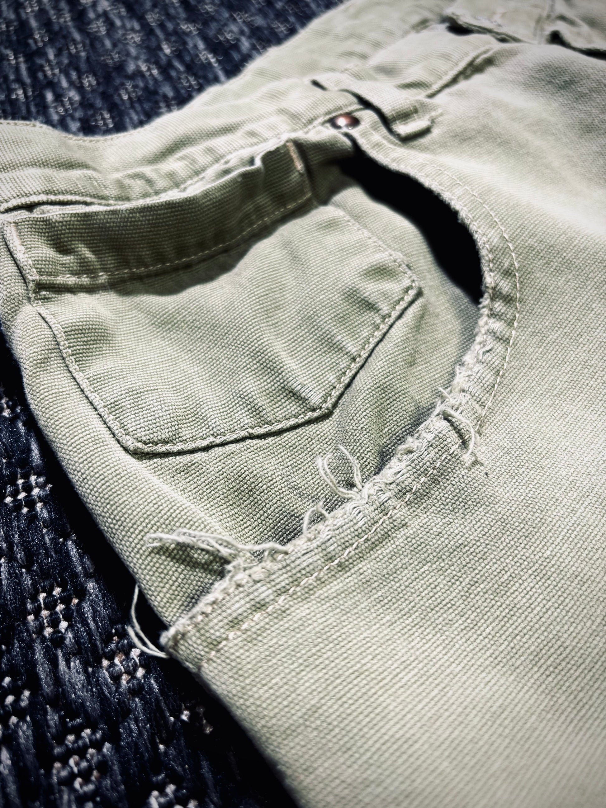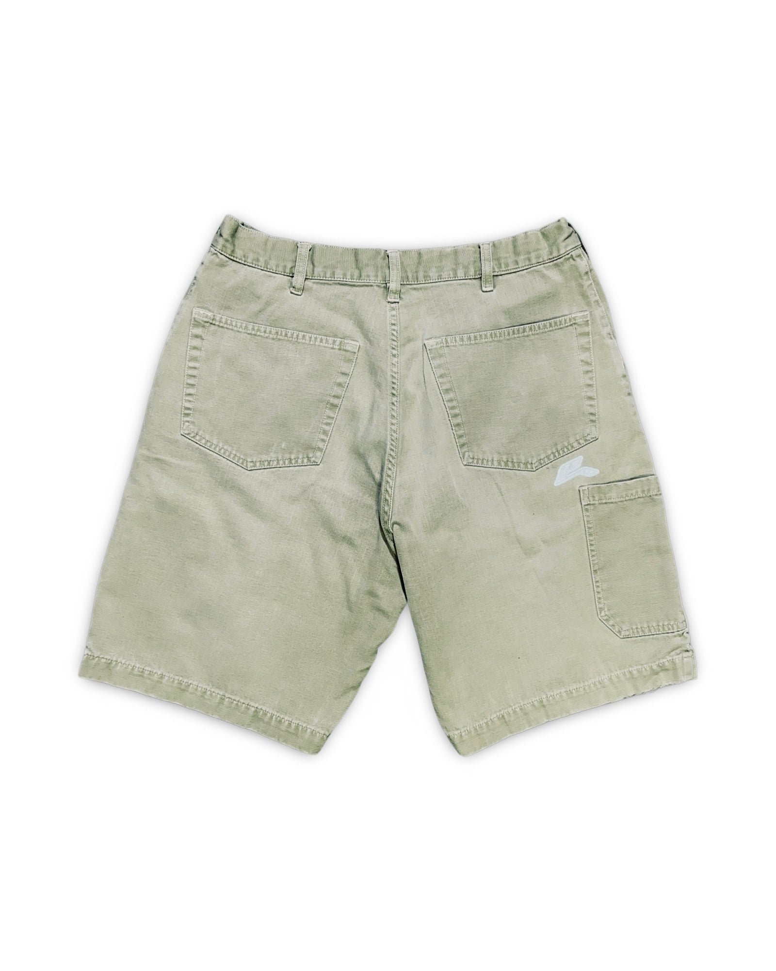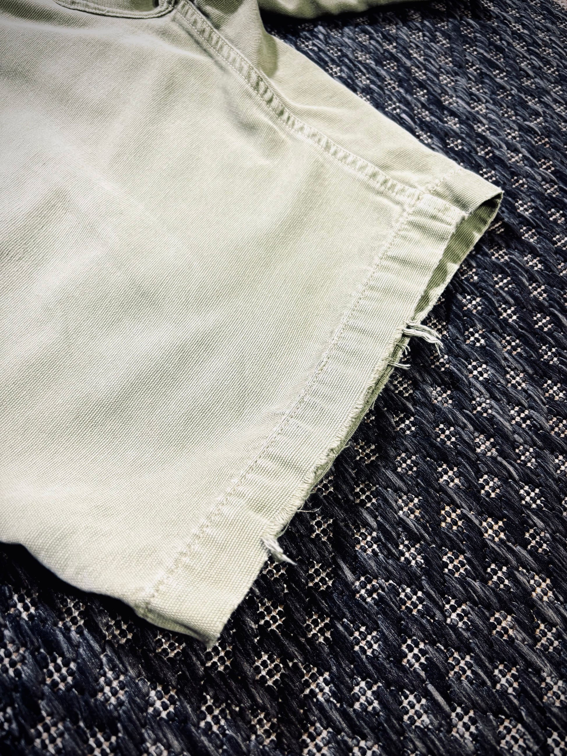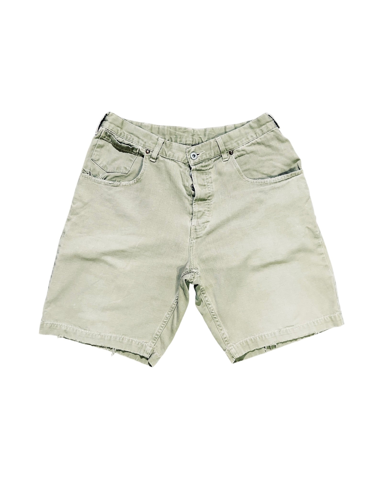 Faded and frayed in all the right places. The ENEVER “Dusted Gap Cuts” are vintage GAP shorts brought back with edge. Featuring raw hems, distressed pocket edges, and a full button fly, these soft olive-tan cotton shorts carry a worn-in feel that doesn’t fake it. A timeless basic with character, revived and stamped by ENEVER. One-of-one. Size 36.