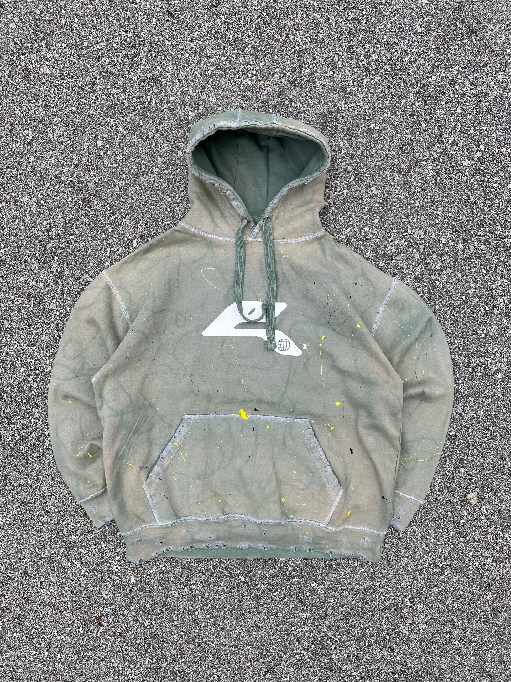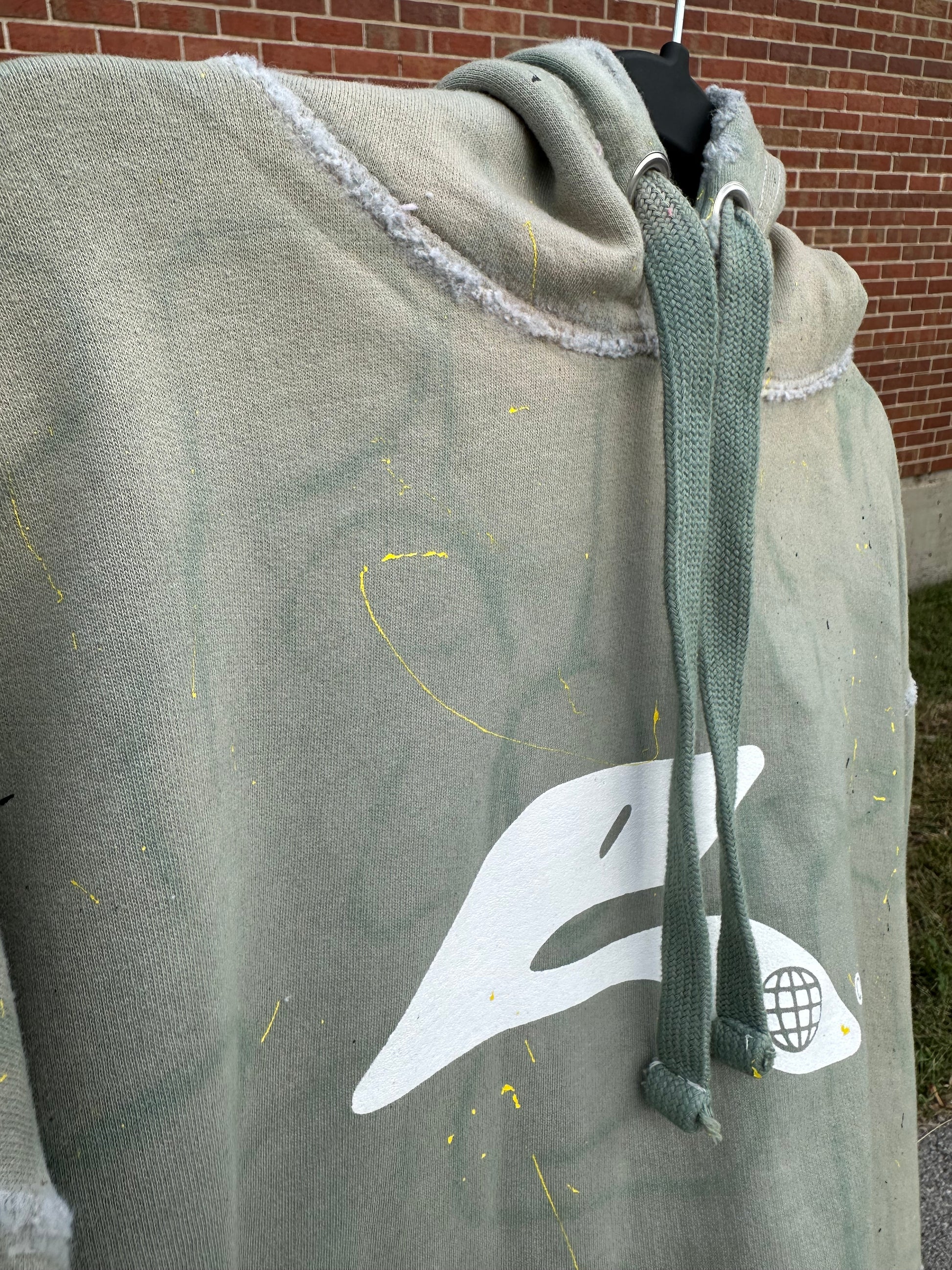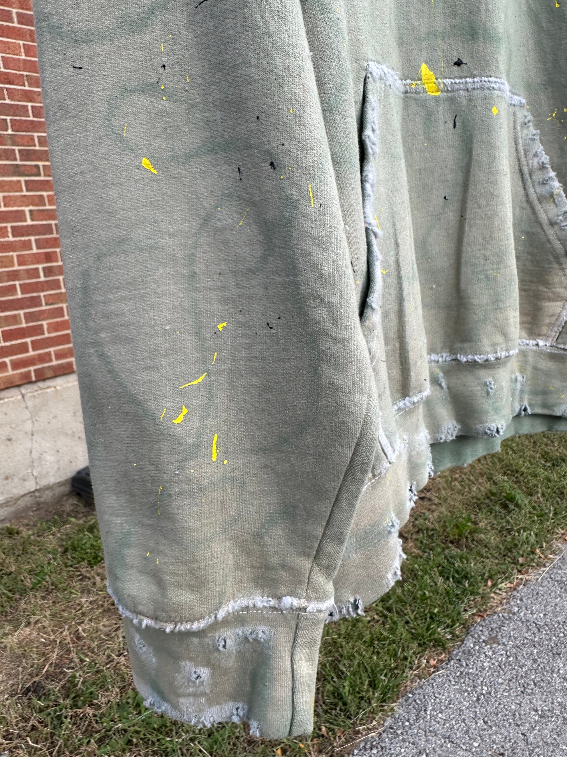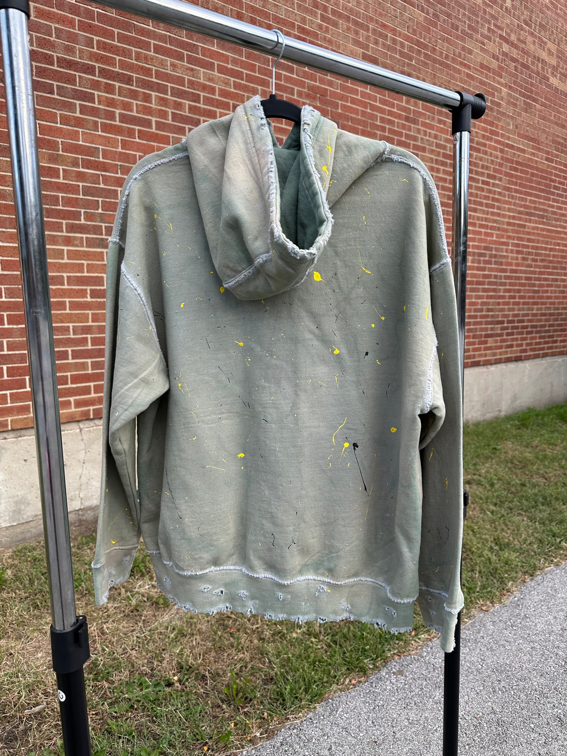This heavyweight hoodie started as a crisp white base before being completely transformed through a hand-dyed and bleached process that created a muted sage-green tone with organic depth. Layered with swirling marble-like textures, each pattern is unique and unpredictable—no two hoodies are the same.
